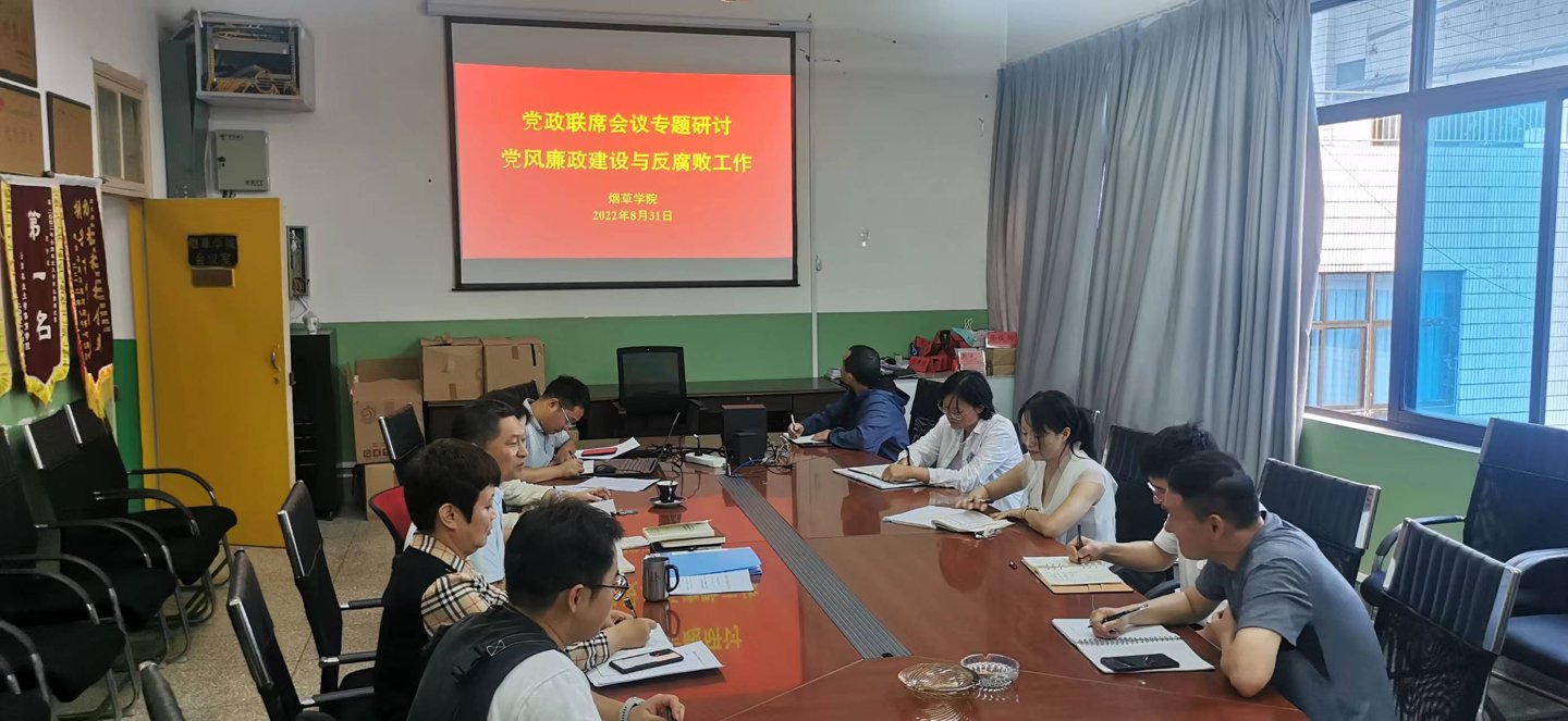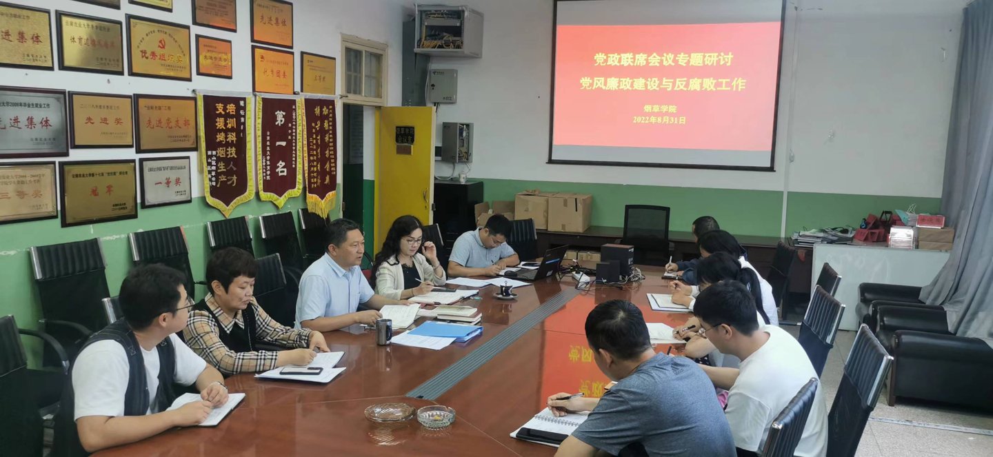 2022年8月31日上午10:00,成人写真 召开了党政联席会议,专题研讨党风廉政建设与反腐败工作,院党委书记李作森主持会议,学院党政领导班子成员、各室所负责人等10人参加了会议。