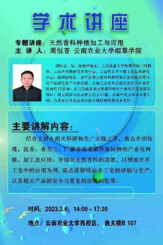为增进学院师生对香料香精行业发展动态与科技前沿的了解,学院于2023年3-6月邀请校内外专家开展相关专题系列讲座。希望大家积极参与。