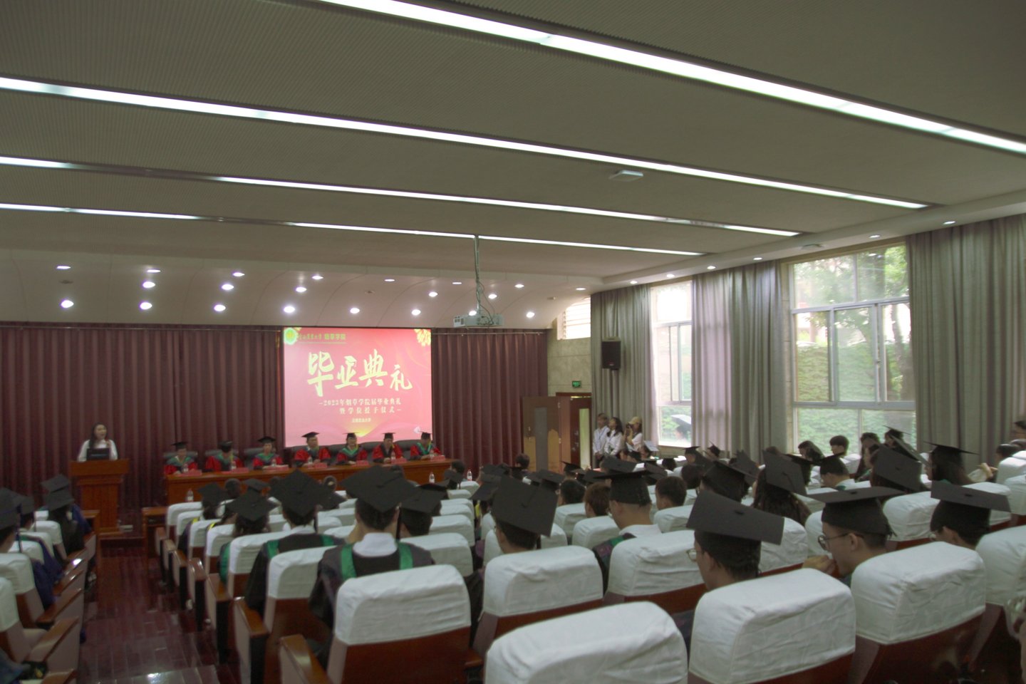 2023届毕业生毕业典礼暨学位授予仪式在成教楼报告厅举行。学院党委书记李作森老师、院长刘雅婷老师、组织员陈建斌老师、副书记王丽萍老师、汤利教授及教师代表等16位老师以及全体2023届毕业生出席此次典礼。