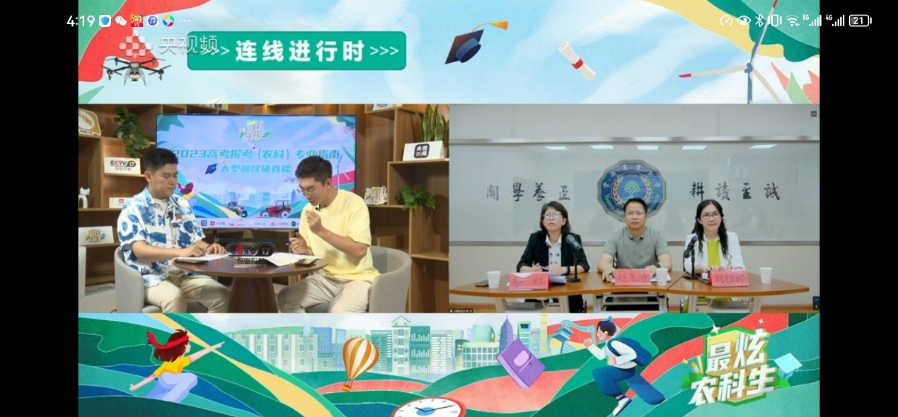 院长刘雅婷教授受邀参加由中央广播电视总台农业农村节目中心、中国农业大学主办,教育部高教司指导,联合全国50余所涉农高校共同发起的“全国涉农高校强农行动——最炫农科生”活动。在央视频大型公益直播“2023高考专业(农科)报考指南”中,刘老师从成人写真