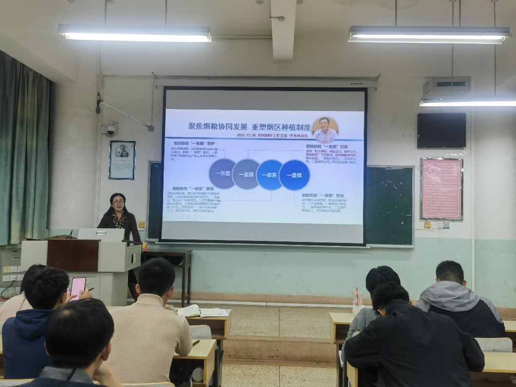 红土地大讲堂”上作“建设农业强国:烟粮协同助力乡村振兴”专题讲座。学院辅导员刘弟老师参加本次讲座,学院烟草专业2021级全体同学和部分2022级、2023级同学到场学习。