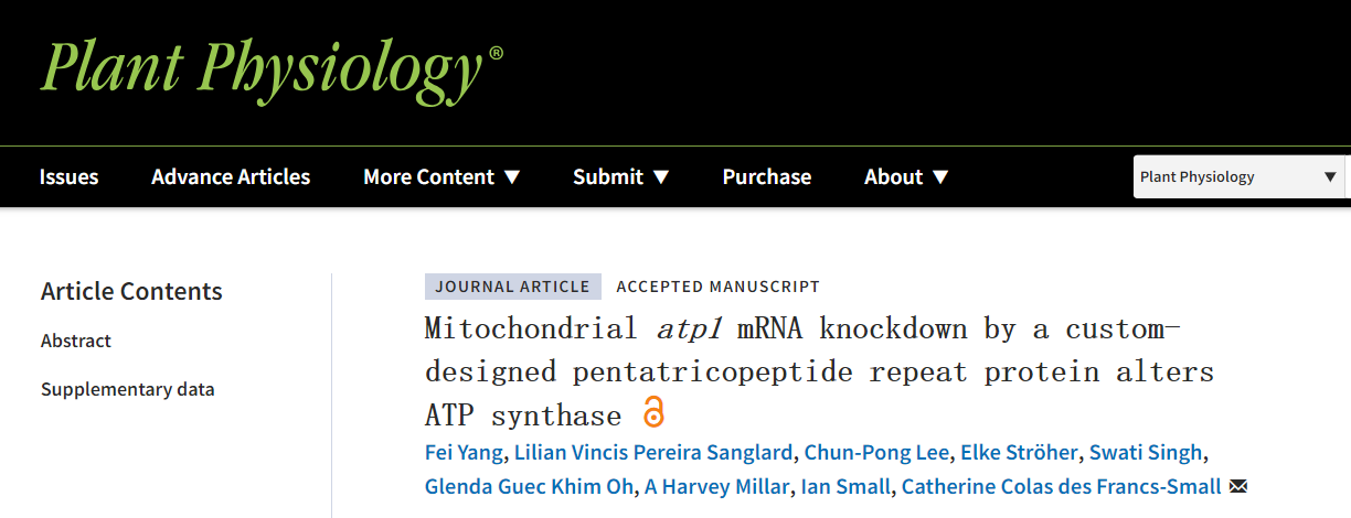 杨飞老师与澳大利亚西澳大学Ian Small课题组合作,在Plant Phyiology在线发表了题为“Mitochondrial atp1 mRNA knockdown by a custom-designed