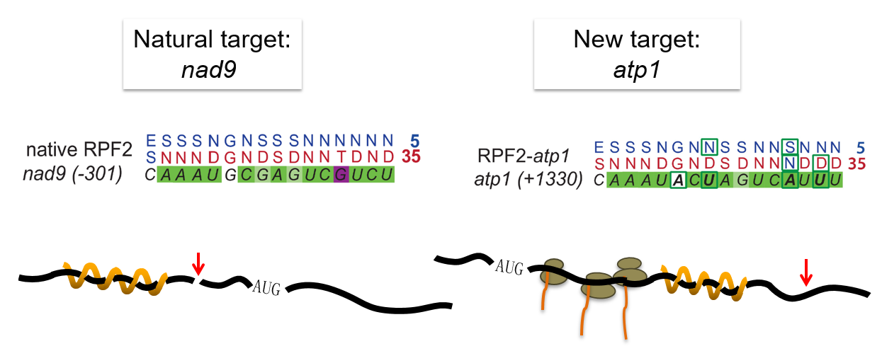 pentatricopeptide repeat protein alters ATP synthase”论文。该论文依据线粒体PPR蛋白与目标RNA之间序列识别的“PPR密码”规则,通过改变部分氨基酸,重新设计了天然PPR蛋白序列,使其从原本识别线粒体RNA的5’非编码区转变为识别目标基因的编码区,造成线粒体目标基因切割而被抑制表达。该技术为研究线粒体基因功能,以及验证植物线粒体细胞质雄性不育基因功能,提供了新的技术手段。