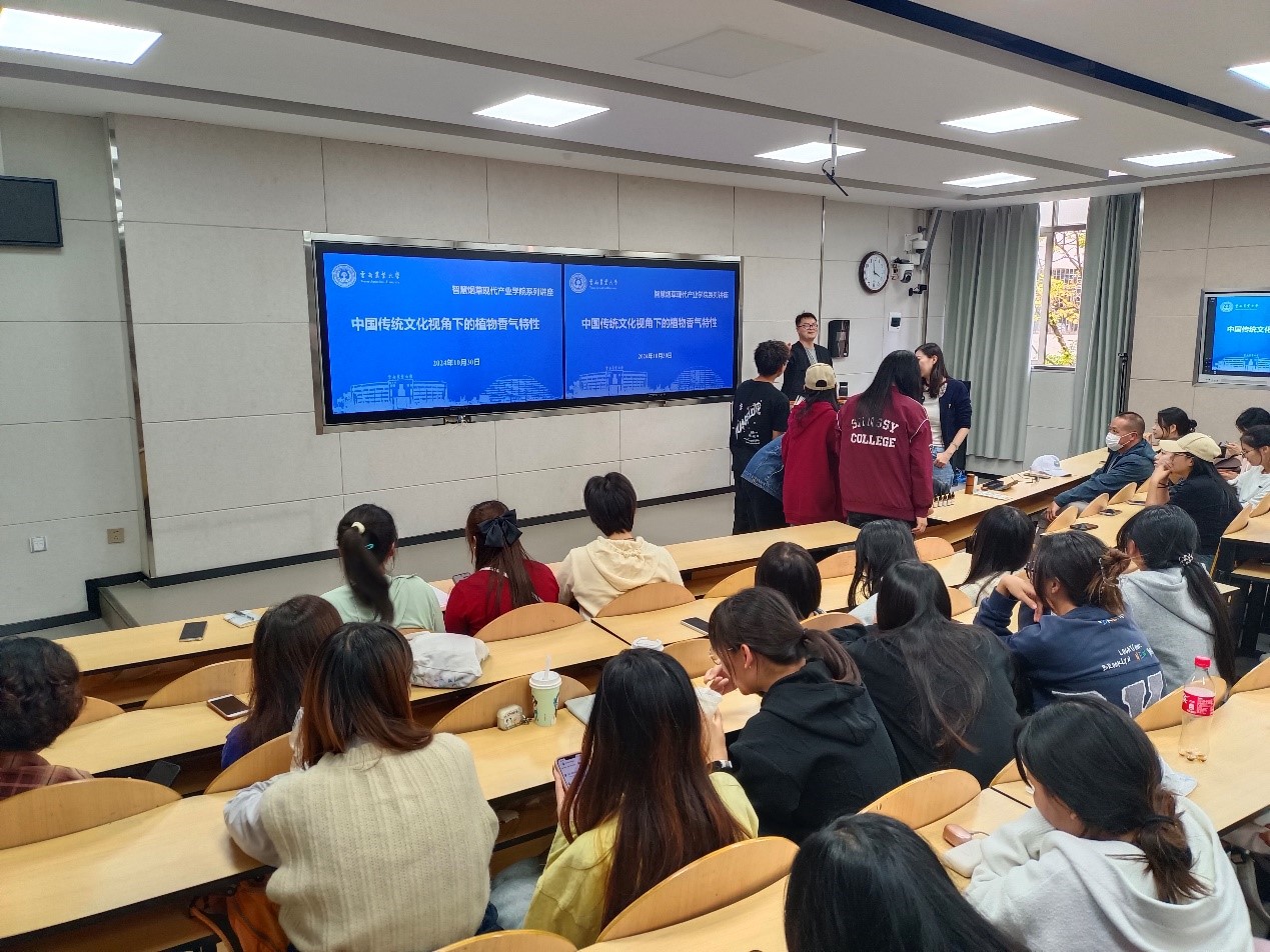 10月30日,国际芳疗师、国家心理咨询师徐文龙做客智慧烟草现代产业学院,并作中国传统文化视角下的植物香气特性的讲座。香料香精技术与工程专业师生共计100余人参加。