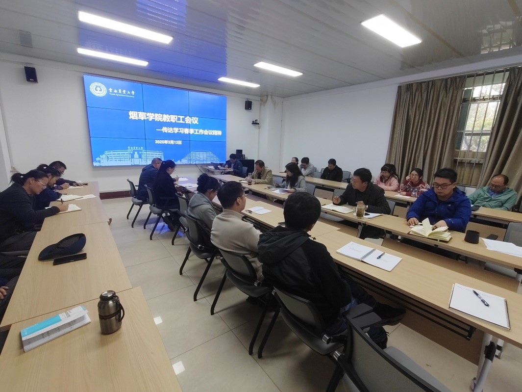 会议传达了黎素梅书记关于创新推进办学治校工作和李永和校长关于全面总结学校2024年工作,部署2025年八项重点工作方面的会议精神。会议要求,学院将认真落实春季工作会议精神,深入贯彻落实党的二十大和党的二十届三中全会精神、全省教育大会和全国教育工作会议精神,落实立德树人根本任务,以抢抓省部共建高校的重要机遇为契机,进一步聚焦教学、科研及社会服务和学生管理就业的工作,谋划好学院2025年重点工作。一是夯实教学根基,筑牢育人主阵地。新学期将重点推进课程体系优化与教学改革,强化“以学生为中心”的教学理念,完善教学督导机制、深化产教融合实践,全面提升教学质量。各教研室需严格落实教学计划,为培养高素质专业人才提供坚实保障。二是抢抓科研机遇,激发创新驱动力。学院将聚焦国家烟草行业重大战略需求,根据已有科研团队,力争在国家级、省部级科研项目立项及科技成果转化上实现新突破。同时,鼓励教师申报行业科技奖项,并定期举办专家讲座,营造浓厚科研氛围。三是构建“就业+升学”双轨服务体系。“导师+学长”帮扶团队,开设考研政策解读、专业课强化等辅导课程,并设立“考研自习专区”,全方位助力学生升学深造。