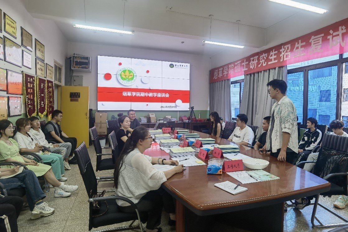 在三楼会议室召开了本科期中教学师生座谈会, 副院长王娜、烟草系主任续勇波、香料香精技术与工程系主任保志娟,教学办主任周鹏及刘弟老师参加了此次会议,认真听取学生代表对教师教学、教学管理、学生管理等方面,尤其是校-院两级教风、学风、课堂教学、实践教学等方面的意见和建议,重点了解学生在学习生活中遇到的问题和困难,并针对相关问题进行了现场解答。